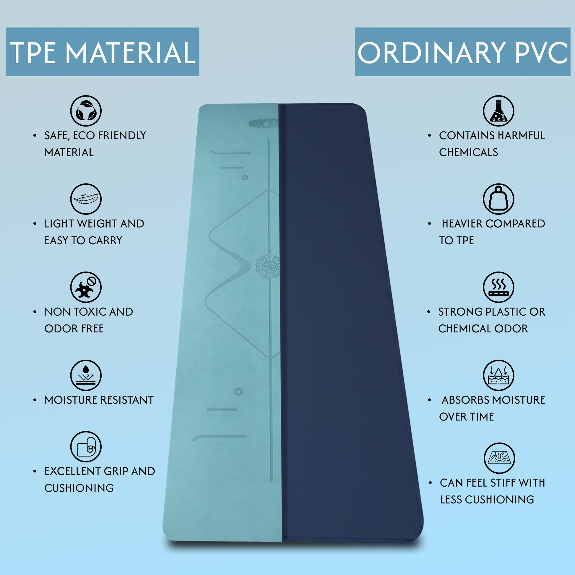 - PREMIUM TPE MATERIAL: Made from high-quality, non-toxic, and eco-friendly TPE material that provides excellent grip, durability, and comfort. The mat is odor-free, recyclable, skin-friendly, and easy to clean for everyday use. . Laser Engraved Position Marking ensuring no toxic chemical Printing