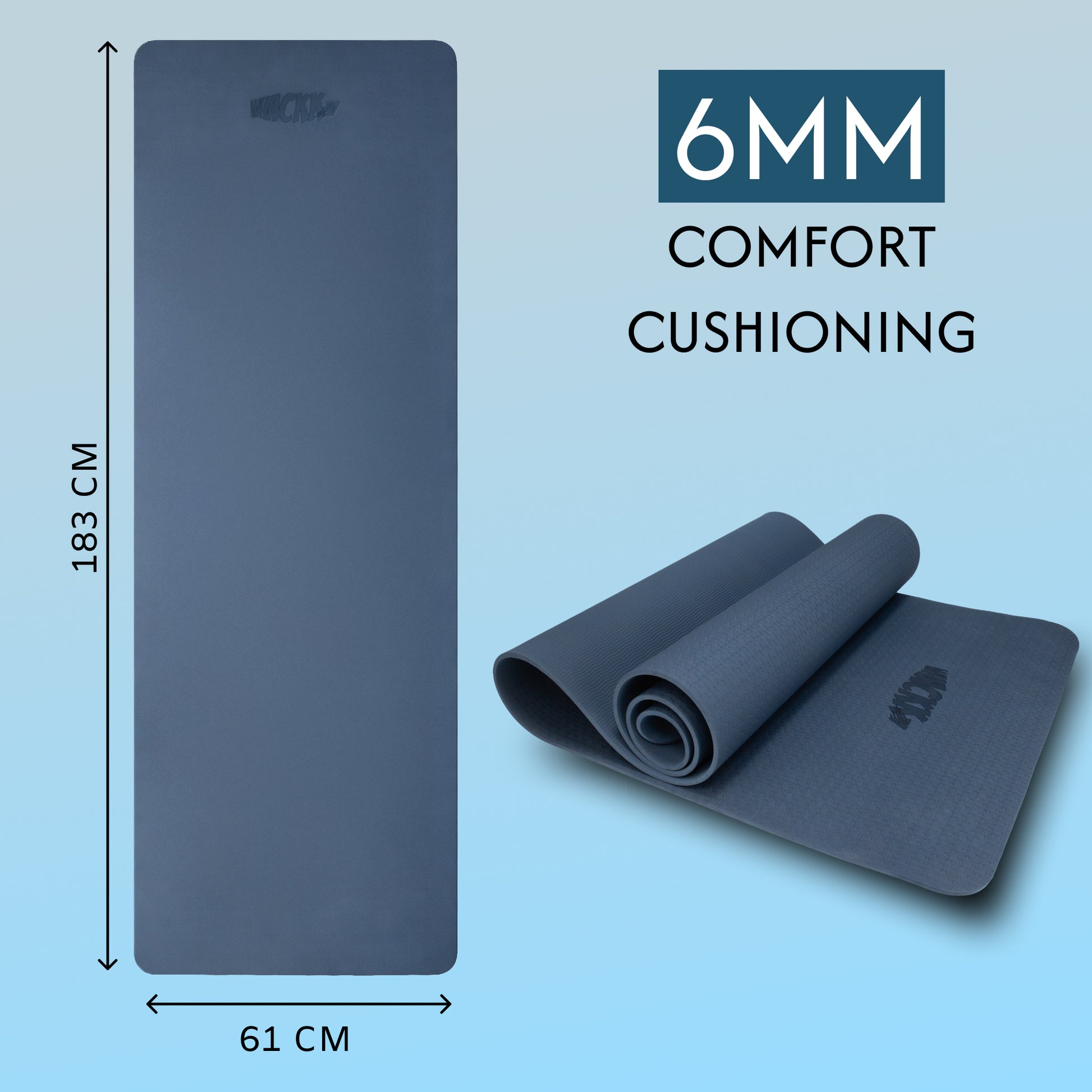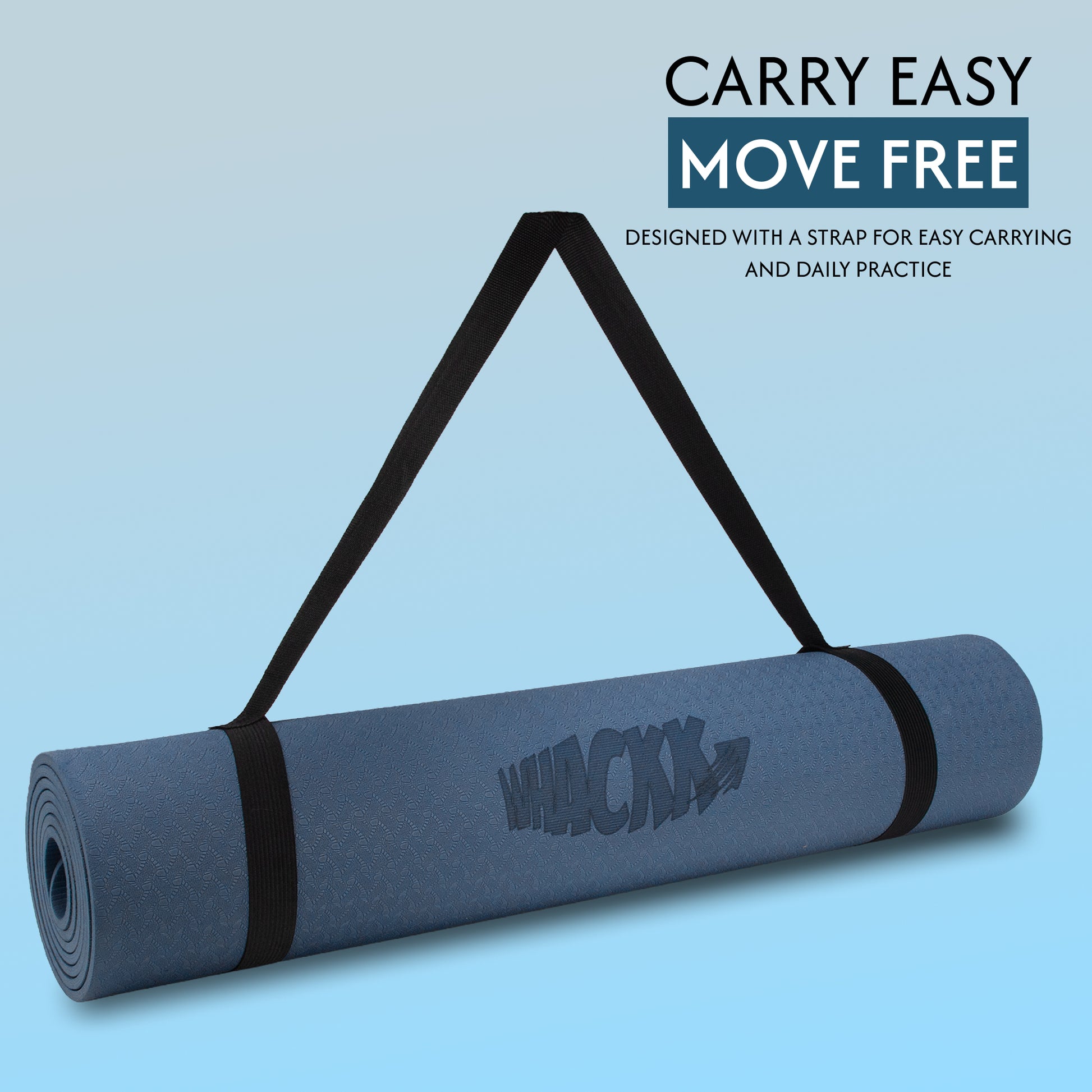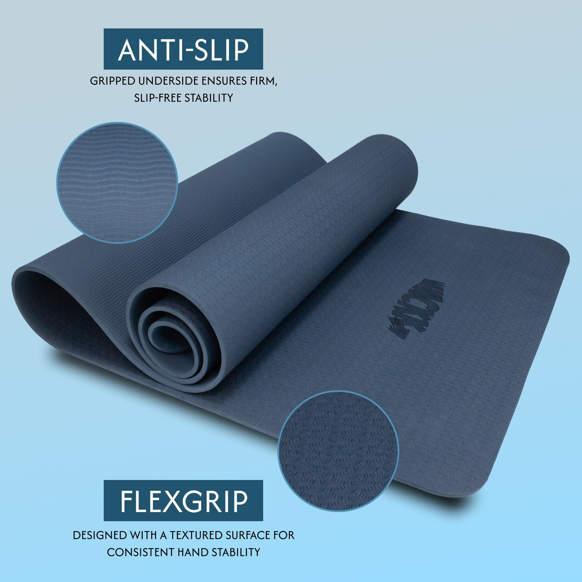 This Alignment Yoga Mat in Navy Blue colour is designed to deliver comfort, stability, and support for your everyday fitness routine. It comes with a sleek carry strap that makes rolling, storing, and transporting the mat easy and convenient—ideal for home workouts, gym sessions, or outdoor yoga practice. Made from premium-quality TPE material, the mat is non-toxic, eco-friendly, and odor-free. It offers excellent grip, durability, and comfort while remaining skin-friendly and easy to clean for everyday use. . Laser Engraved Position Marking ensuring no toxic chemical Printing With an ideal thickness of 6 mm, the mat provides balanced cushioning to help protect joints such as knees, elbows, and back, while maintaining firmness and stability for balance poses and floor exercises. The extra-large size of 183 cm × 61 cm × 6 mm allows ample space for unrestricted movement, making it suitable for all body types and various workout routines. The dual-sided non-slip textured surface enhances grip for both hands and feet, preventing slipping on different floor types and ensuring stability throughout your practice. Weighing just 820 grams, the mat is lightweight, easy to roll, and travel-friendly—perfect for yoga, pilates, stretching, and fitness workouts at home or on the go
