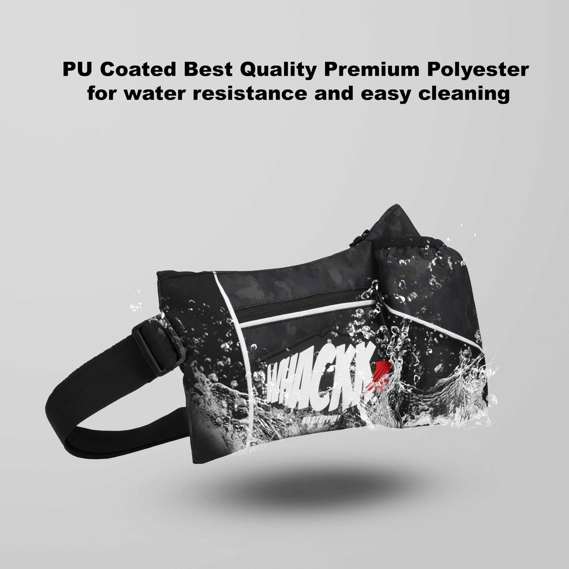 This sleek Whackk Alpine waist bag features a striking black and dark camouflage pattern with white accents. The main zippered compartment is spacious enough for essentials, complemented by a smaller pocket on the right side for quick access and separate bottle holder. The adjustable strap with a plastic buckle ensures a secure and comfortable fit. Stylish and functional, this bag is perfect for casual outings or outdoor activities, blending practicality with modern design.