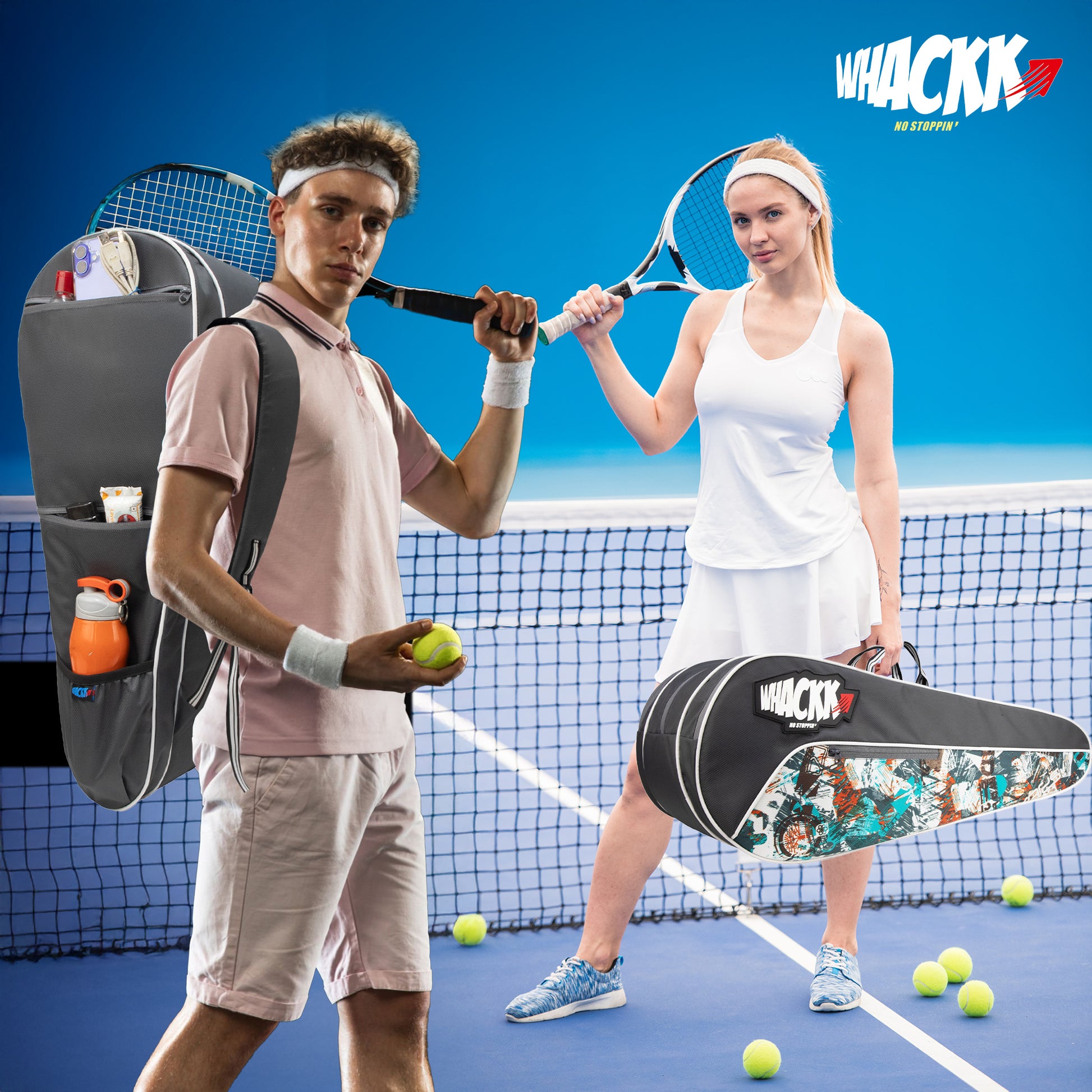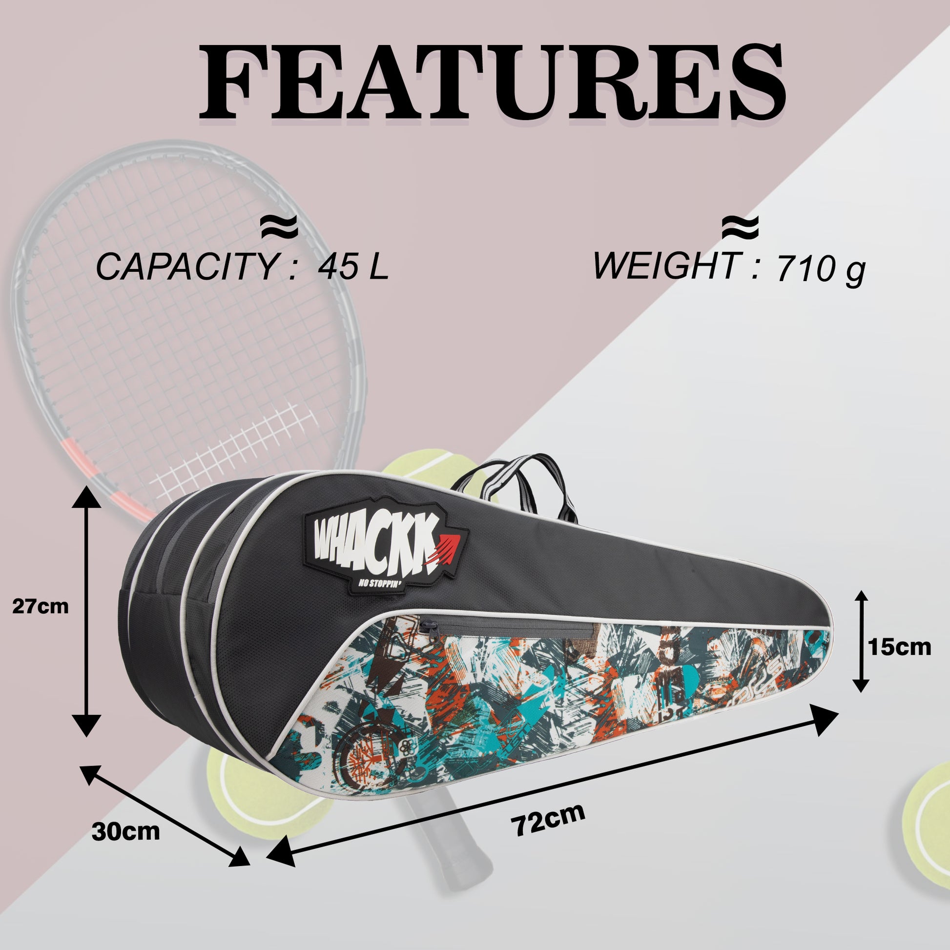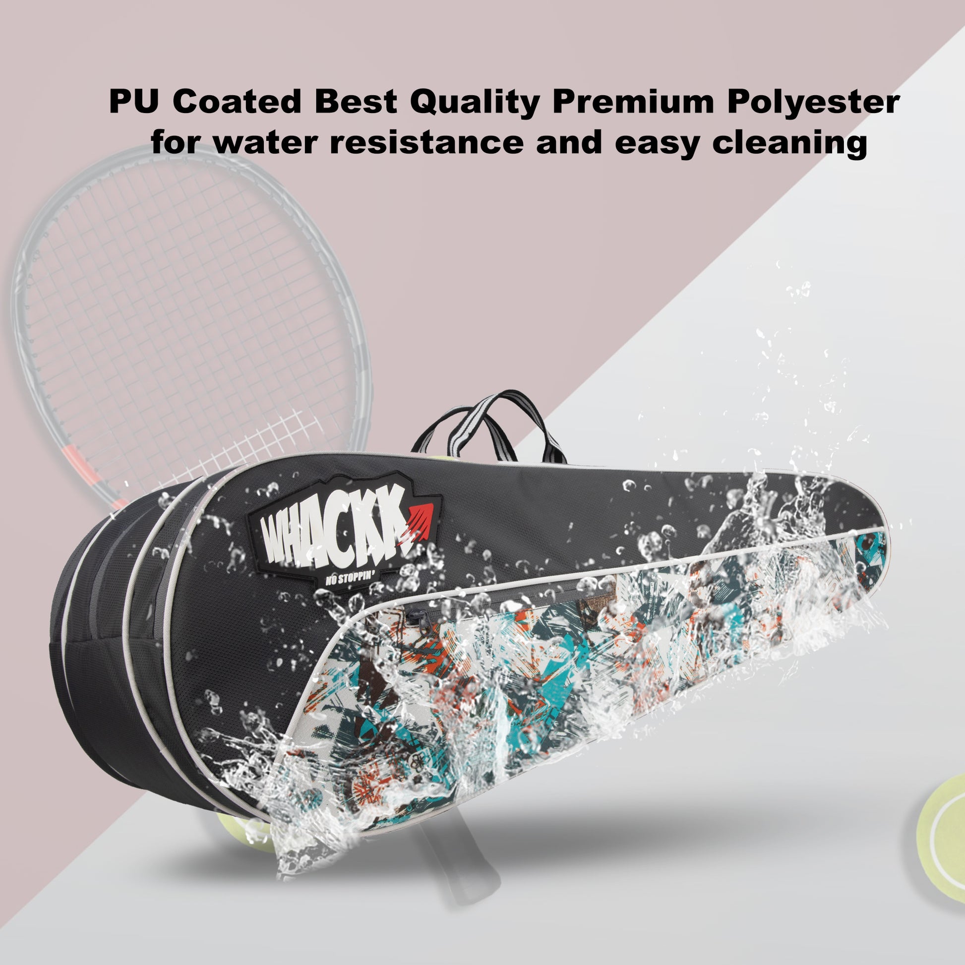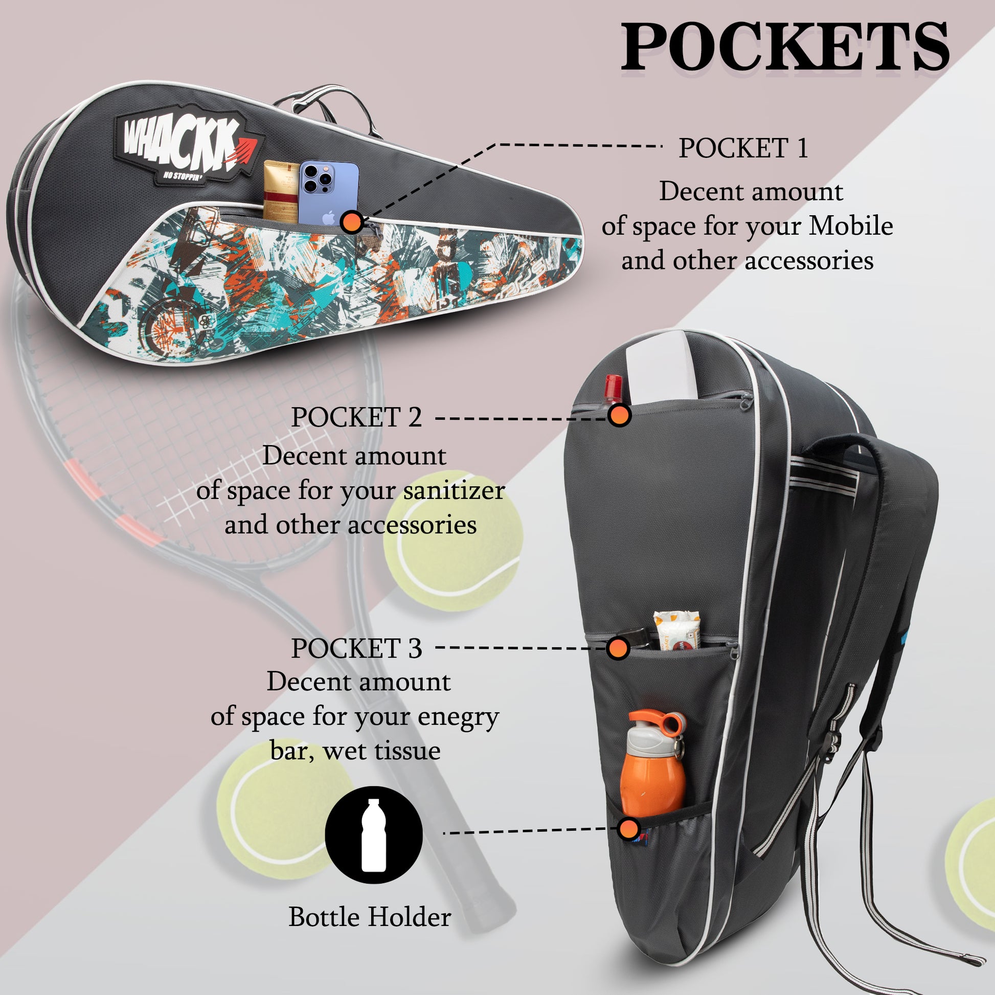 - Pockets: 3 easy access pockets available. These are suitable for all napkins, lunchboxes, mobiles etc. Bottle Holder Also present is a bottle holder easily accessible. 6 Tennis bat / 6 Squash bat / 8 Badminton bat. Whackk promises the best quality and designs at the best prices.