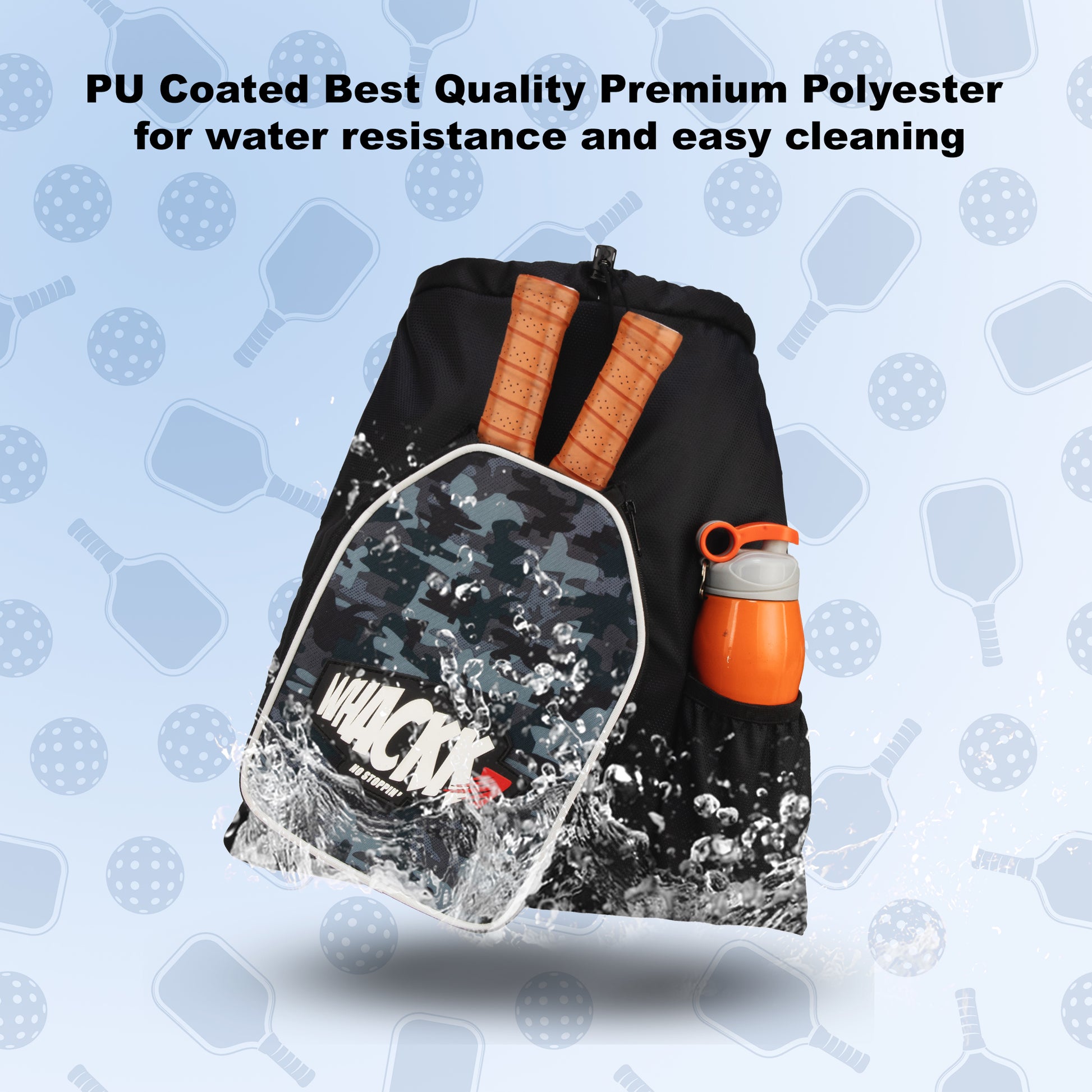 The Whackk Dink pickleball bag combines functionality with style. Featuring a sleek design and the separate bat pocket on the front, this bag makes a statement. The drawstring closure and additional side pocket provide convenient storage for all your gear. Made from durable materials, it's perfect for both casual and competitive players. Stand out on the court with this fashionable and practical bag.
