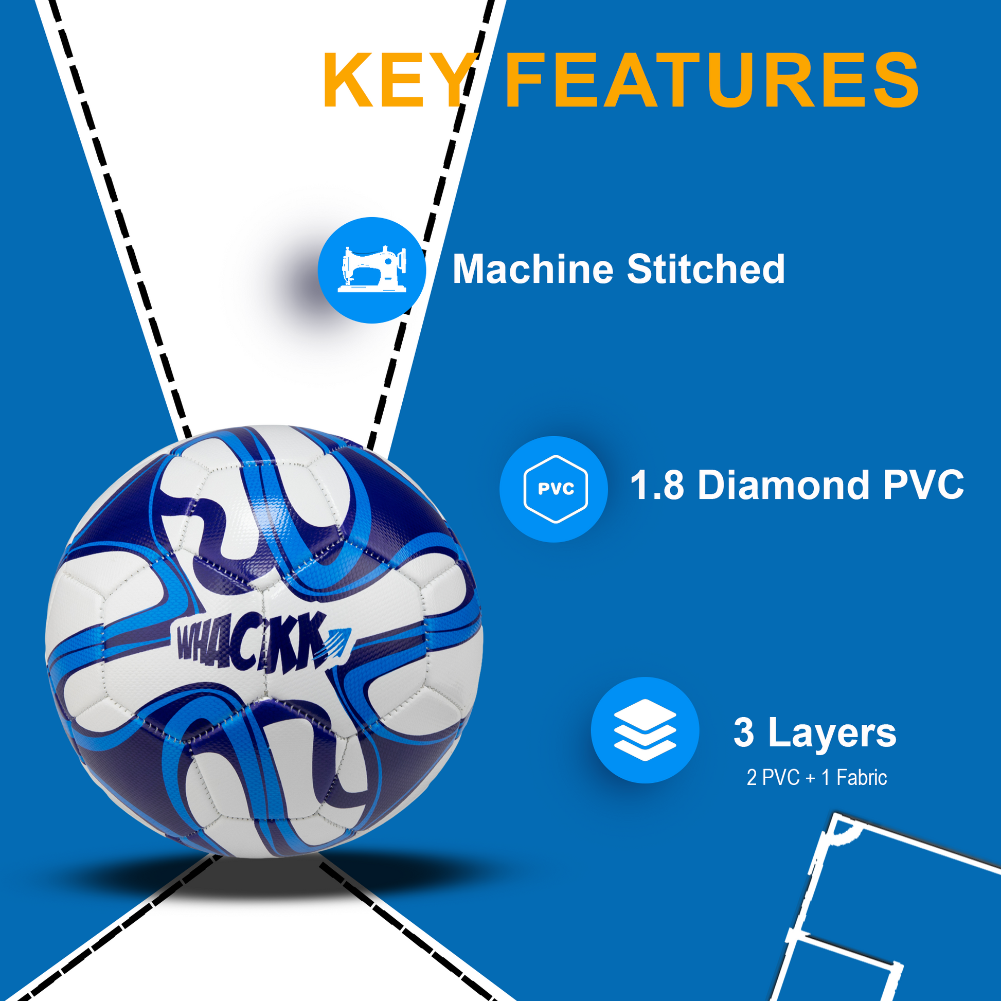Made from premium 1.8mm diamond PVC, it delivers a soft yet firm touch while remaining strong enough for repeated use. Its classic blue and white 32-panel design not only gives it a sporty and stylish appearance but also enhances ball control, flight stability, and tracking during fast-paced play.